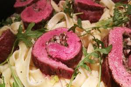 Biefstuk van de flank gevuld met pancetta, mozzarella en courgette. Gemarineerd met een romige marinade.