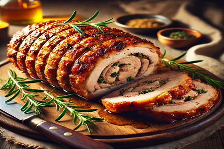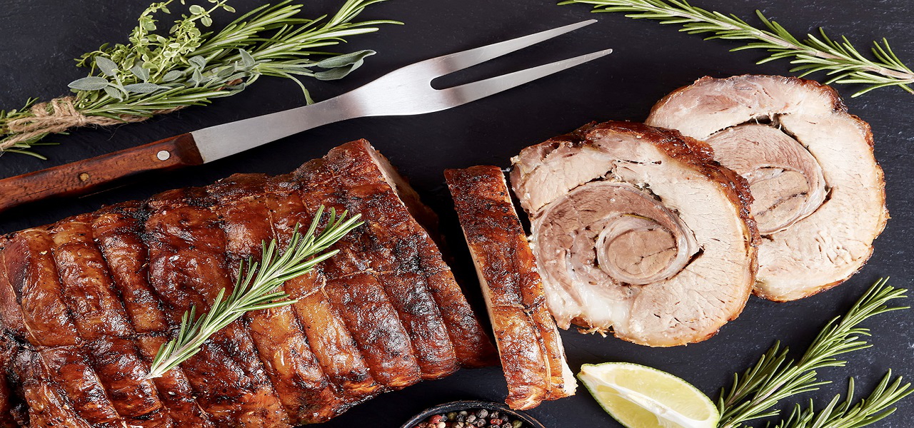 Italiaanse rollade van de middel met tijm, rozemarijn, salie, knoflook en Porchetta.